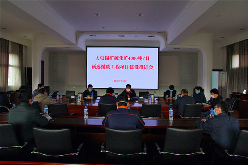 3月5日,大屯锡矿在矿五楼会议室召开硫化矿4000吨/日预选抛废工程项目建设推进会,强调疫情防控不松劲,复工复产再加力,与时间赛跑,加快推进硫化矿4000吨/日预选抛废工程项目建设,将保障大屯锡矿生产经营和高质量可持续发展的各项任务落到实处。