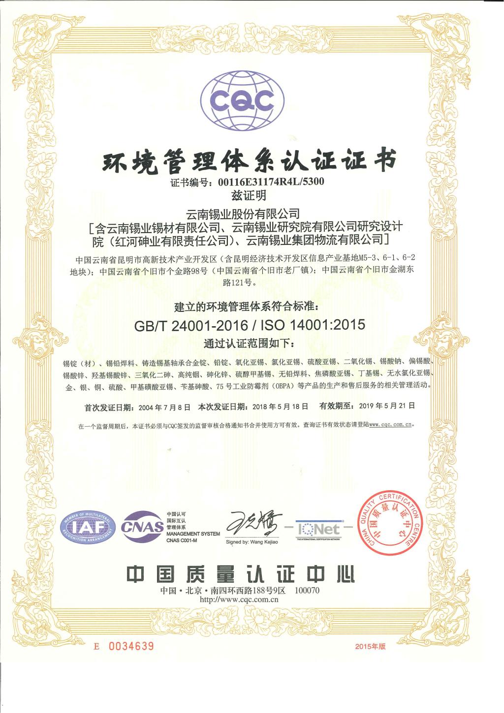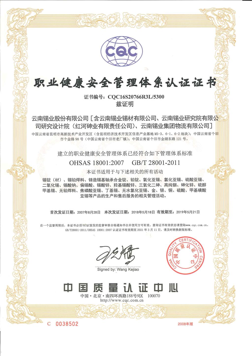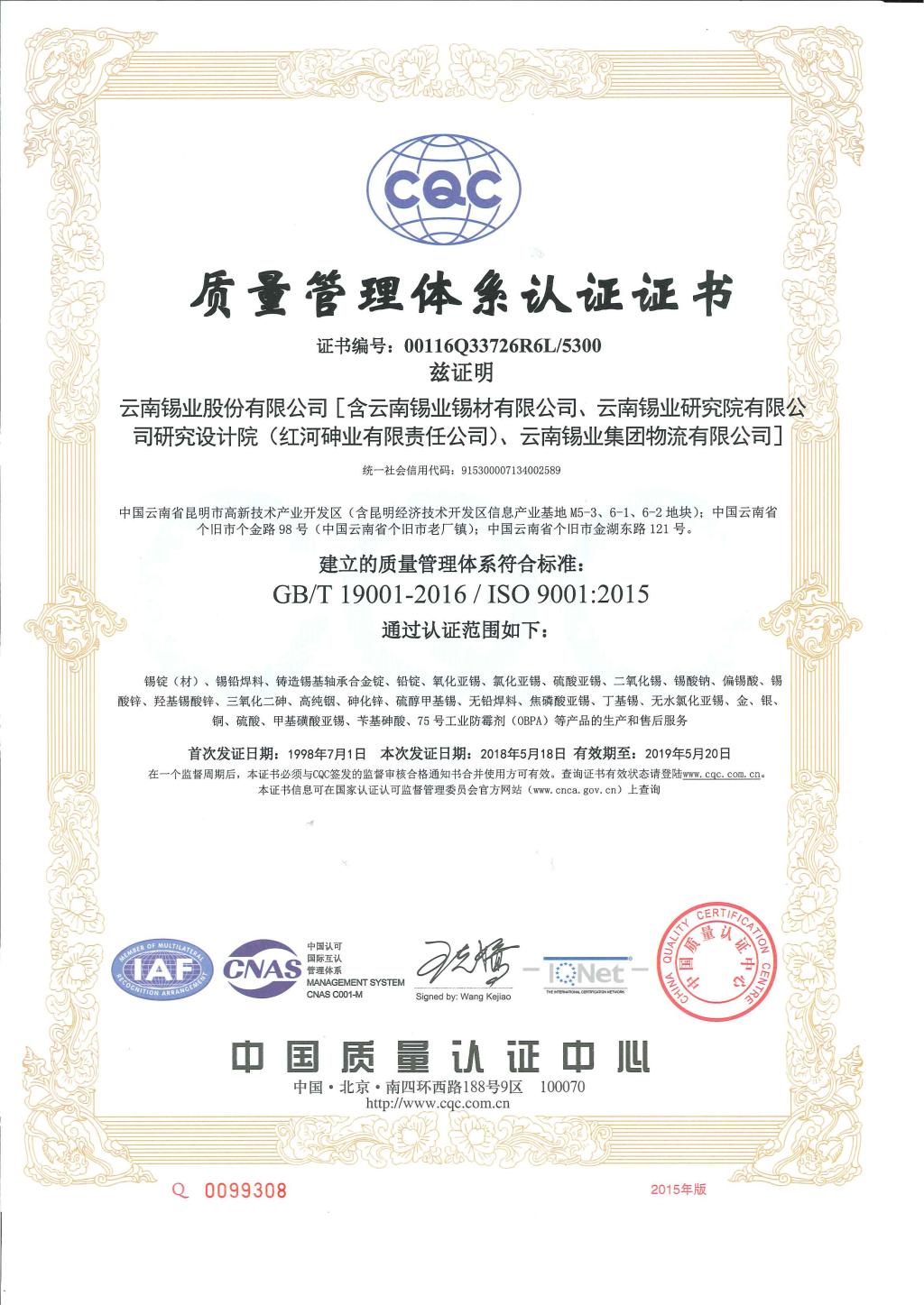 近日,锡业股份质量、环境管理体系通过新版ISO9001:2015、ISO14001:2015标准换版认证审核,职业健康安全管理体系通过OHSAS18001:2007标准年度监督审核,获得证书。