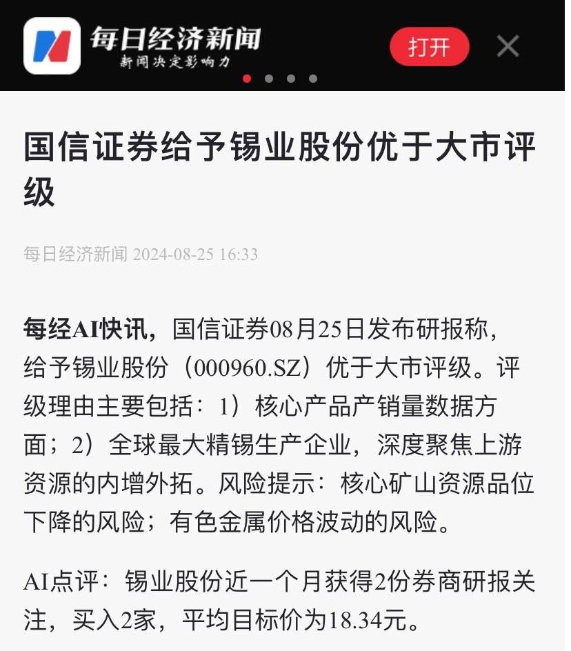 每日经济新闻:国信证券给予锡业股份优于大市评级