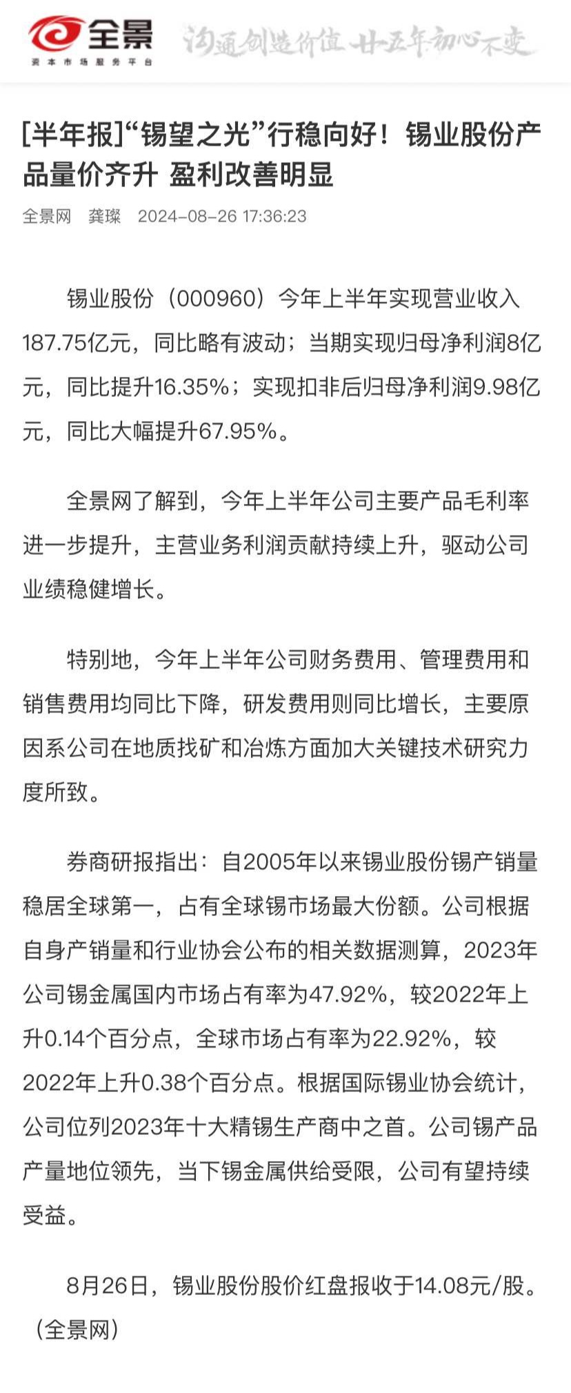 全景网:[半年报]“锡望之光”行稳向好!锡业股份产品量价齐升 盈利改善明显