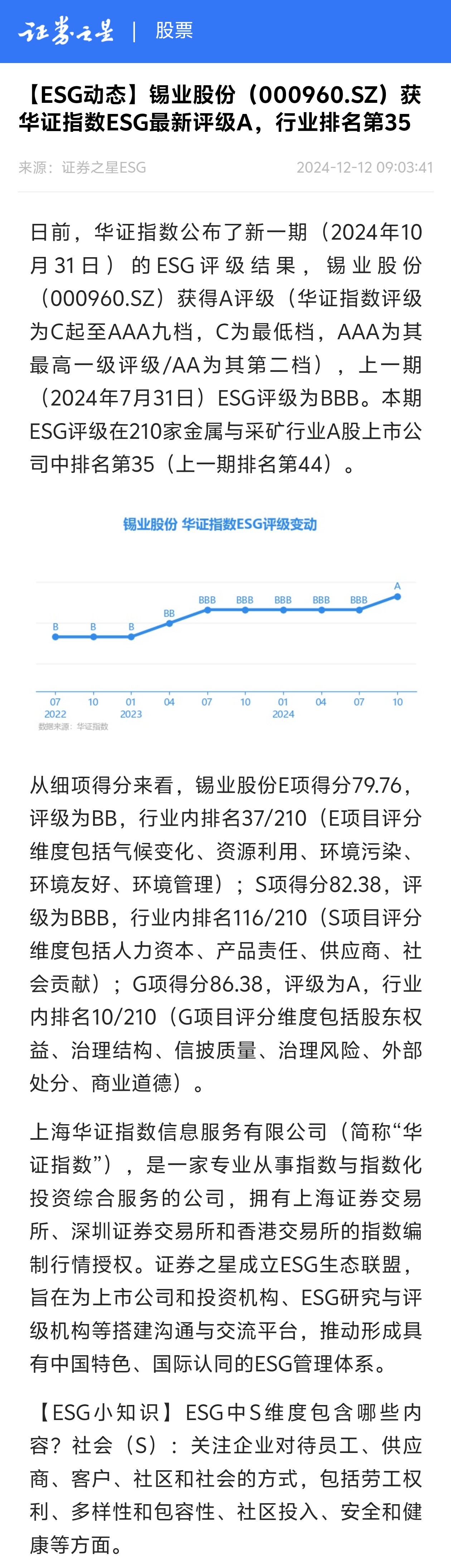 证券之星:锡业股份获华证指数ESG最新评级A,行业排名第35