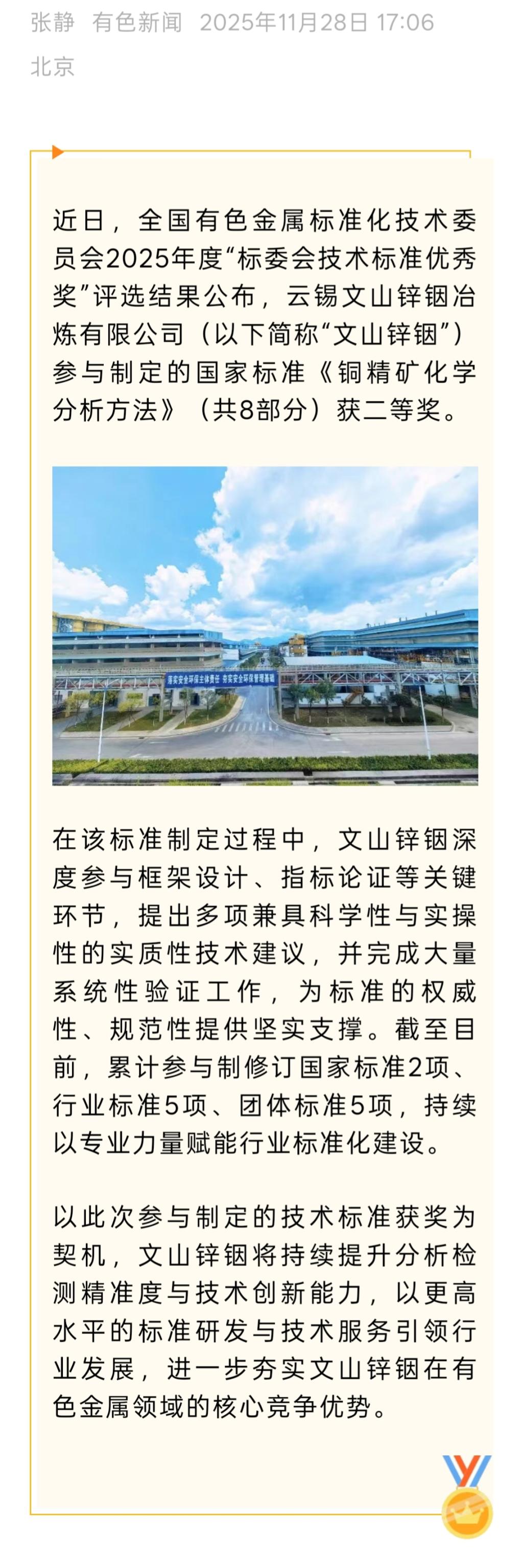有色新闻:文山锌铟参与制定的行业标准荣获全国有色标委会技术标准优秀奖